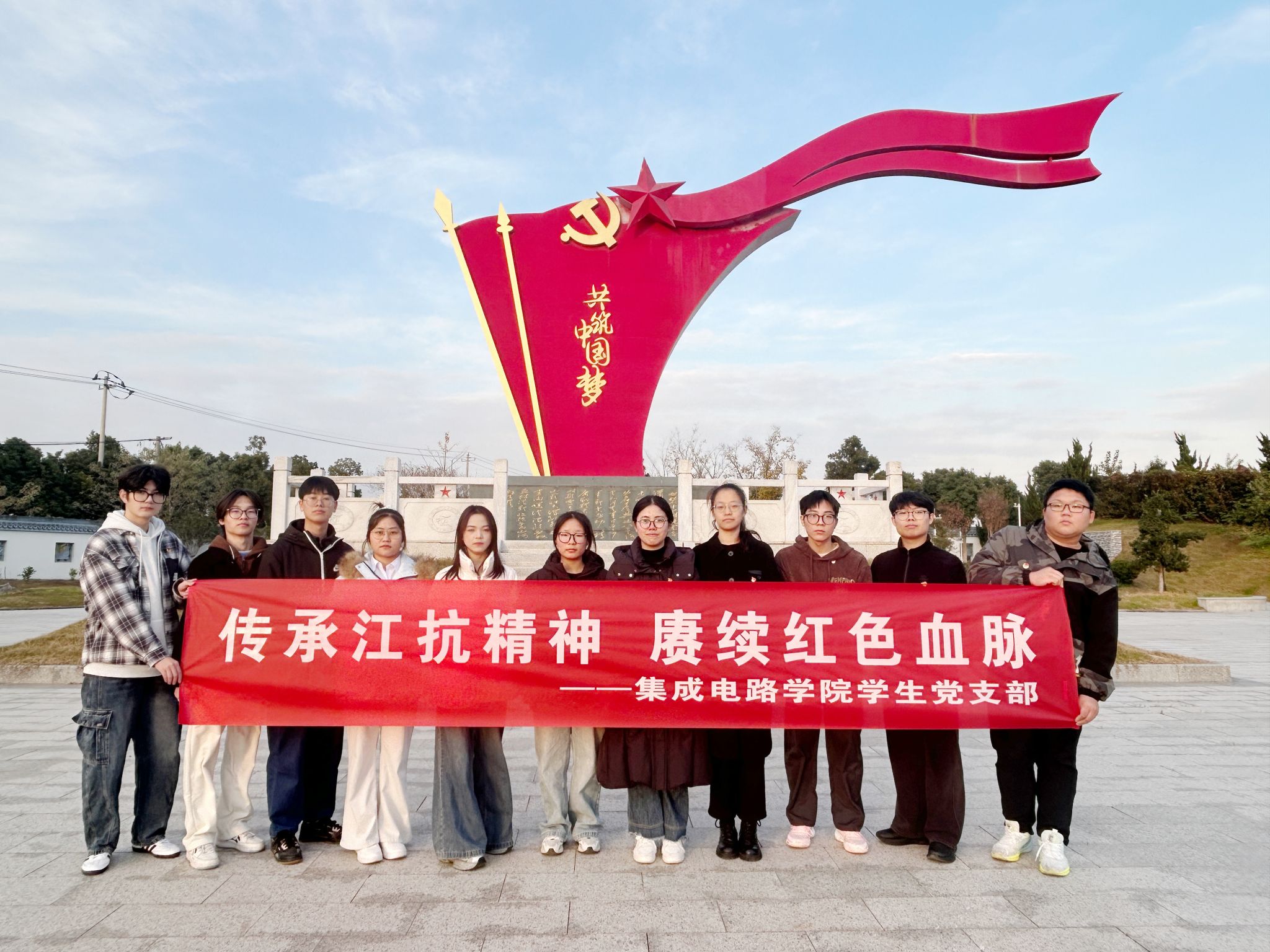 为深入学习贯彻党的二十届四中全会精神,传承弘扬伟大抗战精神,12月4日下午,集成电路学院学生党支部赴无锡新四军江抗东进纪念馆,开展以“传承江抗精神 赓续红色血脉”为主题的党日活动。活动通过实地参观学习与庄严的宣誓仪式,引导学生党员从革命历史中汲取精神力量,坚定投身国家集成电路事业的理想信念。