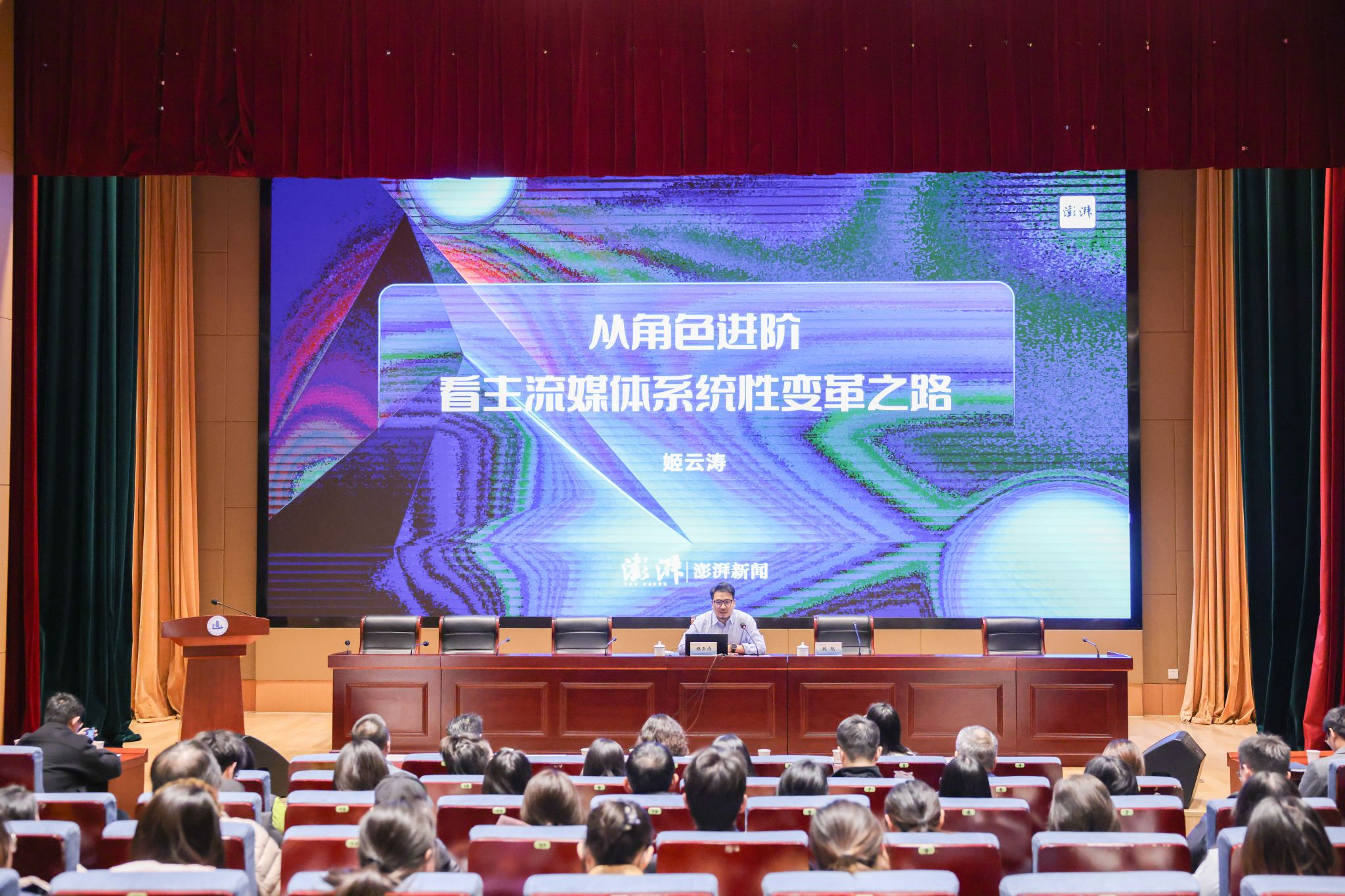 姬云涛以《从角色进阶看主流媒体系统性变革之路》为主题,结合澎湃新闻自身的发展历程与战略转型,从内容侧、运营侧、技术侧深入剖析在技术驱动与生态重塑背景下,主流媒体所经历的深刻角色演变,阐述了当前媒体生态面临的系统性变革。他强调,优质深度内容依然是核心竞争力,但须依托数据洞察、可视化叙事、人工智能等新技术手段进行创造性转化;同时,媒体需构建开放协同的生态系统,从“单向传播”转向“双向赋能”,在与用户的深度互动中巩固公信力、拓展影响力。整场讲座既有宏观行业的洞察,也有鲜活的实践案例,为在场师生理解全媒体传播体系构建提供了宝贵思路。
