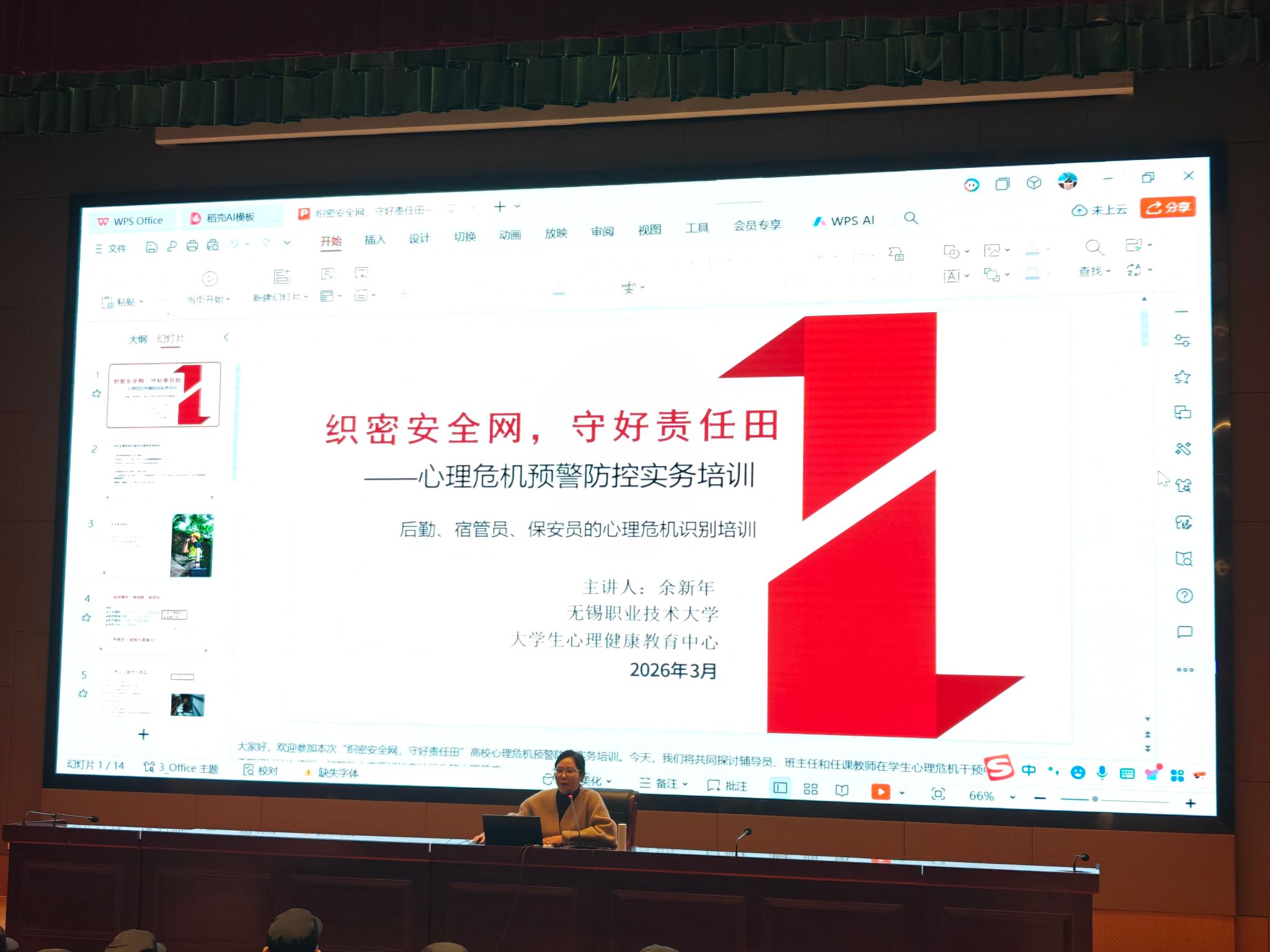 宿管员与保安员身处学生日常管理服务一线,在发现学生异常情况方面具有“第一时间、第一现场”的优势。3月25日上午,学校在厚德楼一楼报告厅组织开展了面向全体宿管员、保安员的“心理危机预警防控实务培训”,由江苏省心理健康教育名师工作室负责人、大学生心理健康教育中心余新年老师主讲。培训紧扣“看得懂、会应急、守边界”三大目标,系统梳理了常见心理危机类型,详细解读心理危机高危信号识别清单。针对后勤安保一线工作场景,培训明确了现场处置“四步法”,厘清不同岗位的规范操作与职责边界,并通过场景演练,进一步强化参训人员的应急处置能力。后勤处、保卫处相关负责人表示,将以此次培训为契机,持续加强对一线人员的指导,推动学以致用,切实将心理育人理念融入日常管理与服务之中,共同守护学生平安健康。