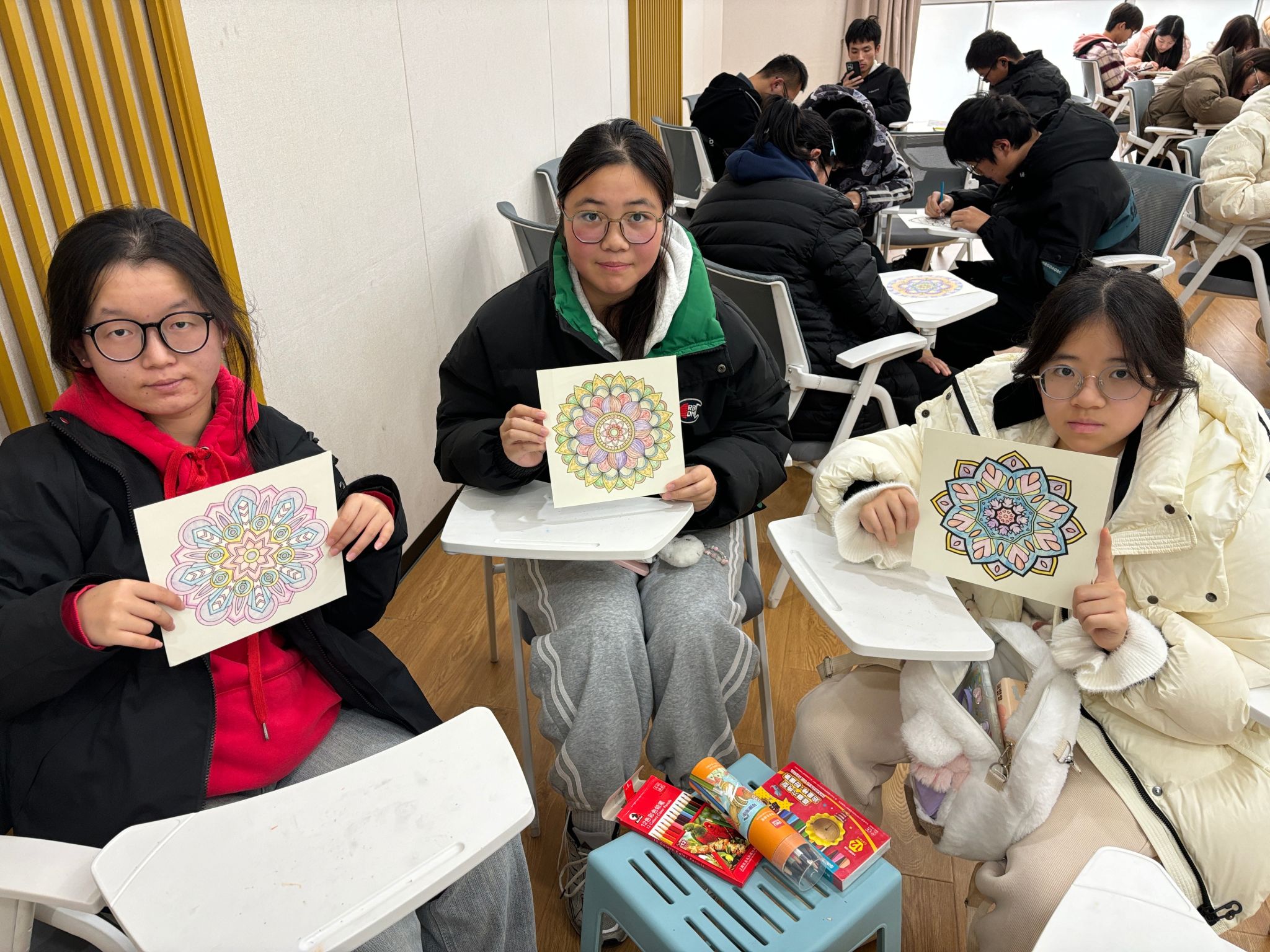 绘制过程中,同学们神情专注,以色彩表达情感,借笔触舒缓焦虑。从清淡铺色到细致勾描,每一笔都成为压力转化与情绪表达的契机。许多同学在对称而精致的图案间逐渐静下心来,感受到内心的放松与安宁。